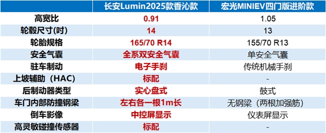 安全是购车时的首要考虑因素。长安Lumin在这方面表现卓越:0.91宽高比使车身更协调,车身稳定性也更高;14英寸轮毂+ 165mm宽胎抓地力更强,高速过弯、雨天行车更稳;全系标配四轮盘式制动(宏光mini为前盘后鼓),紧急情况刹停更快。
