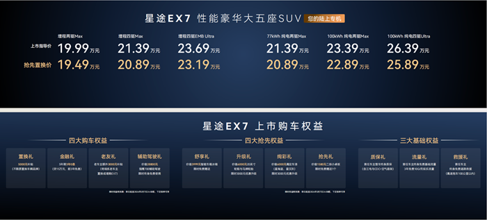 星途EX7官方指导价19.99万元—26.39万元,抢先置换价19.49万元起。截至5月31日,购车可享多重权益:置换礼、金融礼、辅助驾驶礼等四大购车权益,叠加舒享礼、升级礼等四大抢先礼,总价值达52800元。首任车主更享整车+三电终身质保、终身免费基础流量、终身免费道路救援。